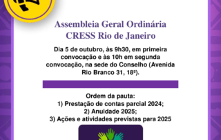 Seccional Norte Fluminense 1ª Reunião Ampliada - 2025 Dia 13 de maio – 18h Eleição de assistente social representante da Seccional Norte Fluminense para os Encontros Nacional e Descentralizado. Rua 21 de Abril, nº 272 [...]