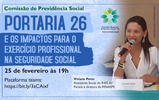 A Comissão de Previdência Social do CRESS Rio de Janeiro realiza, no próximo dia 25 de fevereiro às 19h, reunião online sobre a Portaria 26 e os impactos para o exercício profissional na Seguridade Social. [...]