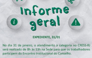 🌿 Expediente na Sede do CRESS-RJ ℹ️ Informamos que no dia 31 de janeiro o atendimento à categoria será realizado de 8h às 13h na Sede para que os trabalhadores participem do Encontro Institucional do [...]