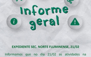 Informamos que no dia 21/02 as atividades na Seccional Norte Fluminense estão suspensas por motivos intempestivos. Os Serviços Online seguem funcionando no site do CRESS-RJ. #descricaodaimagem Cartaz em fundo acinzentado e faixa verde na parte superior [...]