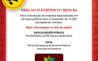 Mais informações: Edital Pregão 90003-2024 #Descricaodaimagem Texto em borda em tons vermelhos com megafone destacado em círculo branco. Na parte inferior central, a logo do CRESS-RJ. Texto: PREGÃO ELETRÔNICO CRESS-RJ. Para contratação de empresa especializada em serviços gráficos [...]