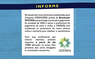 Em função das novas diretrizes estabelecidas pelo Conjunto CFESS/CRESS através da resolução 942/2020, que prorroga o prazo para pagamento da anuidade de 2020 e isenta o profissional do pagamento de juros e multa, o CRESS/RJ [...]