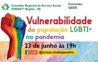 Antecipando as celebrações do Dia Mundial do Orgulho LGBTI+, comemorado dia 28 de Junho, o CRESS Rio realiza, no próximo dia 23, às 19h, através do Facebook do Conselho, a live “Vulnerabilidade da população LGBTI+ [...]