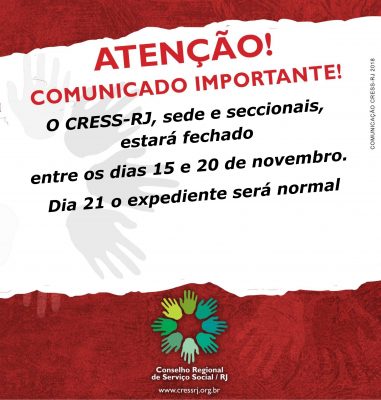 Ver Imagem Maior Aviso Importante melhorweb2018-11-13T17:54:40-02:0013/11/2018 17:54|Categorias: Destaques|Nenhum Comentário O CRESS-RJ, sede e seccionais, estará fechado entre os dias 15 e 20 de novembro. Dia 21 o expediente será normal Notícias Relacionadas 18º Encontro de Gerações do Serviço Social CRESS-RJ e CBCISS acontecerá dia 26 de novembro, a partir das 14:30h, na Sede do CRESS-RJ; participe! 11/11/2025 15:44 📢 Eleições CFESS-CRESS 2026-2029: quem escolhe é você! 06/11/2025 18:01 ATENÇÃO ASSISTENTES SOCIAIS DO SUAS E POPULAÇÃO ATENDIDA, SE LIGUEM NESTAS DICAS DO CRESS! 06/11/2025 15:13 O CRESS/RJ reafirma o repúdio à ação genocida provocada por agentes de Estado e reforça o compromisso da categoria das assistentes sociais com a defesa intransigente dos direitos humanos! 30/10/2025 12:59 Hoje, quarta-feira, dia 29 de outubro, os atendimentos na sede do CRESS Rio foram suspensos a partir das 16h. 29/10/2025 16:23 Nesta terça-feira, dia 28 de outubro os atendimentos no CRESS Rio, na sede, foram suspensos à partir das 15h. 28/10/2025 15:25