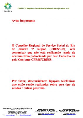 O Conselho Regional de Serviço Social do Rio de Janeiro 7ª Região (CRESS-RJ) vem comunicar que não está realizando venda de nenhum livro patrocinado por esse Conselho ou pelo Conjunto CFESS/CRESS.