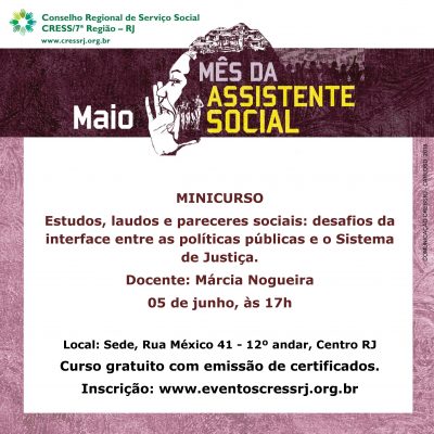 Sede – Minicurso: Estudos, laudos e pareceres sociais: desafios da interface entre as políticas públicas e o Sistema de Justiça. Docente Márcia Nogueira. Dia 05/05, às 17h. Local Rua México, 41, 12º andar, Centro – Rio de Janeiro