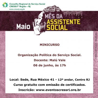 Sede – Minicurso: Organização Política do Serviço Social. Docente: Malú Vale. Dia 06/06, às 17h. Local: Rua México, 41, 12º andar, Centro – Rio de Janeiro