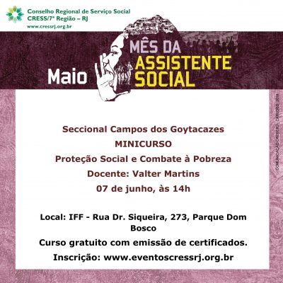 Seccional Volta Redonda – Minicurso: Serviço Social e Educação. Docente: Carlos Felipe Nunes Moreira. Dia 13/06, às 17h. Local: Rua General Oswaldo Pinto da Veiga, 350 – 1001/1003 – Shopping Pontual, Vila Santa Cecília