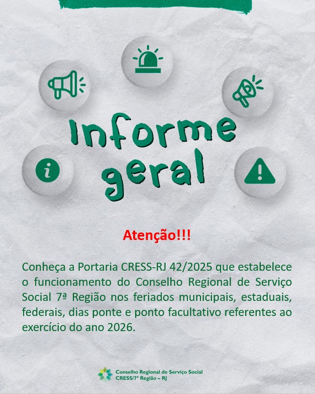 Conheça a Portaria CRESS-RJ 42/2025 que estabelece o funcionamento do Conselho Regional de Serviço Social 7ª Região nos feriados municipais, estaduais, federais, dias ponte e ponto facultativo referentes ao exercício do ano 2026.