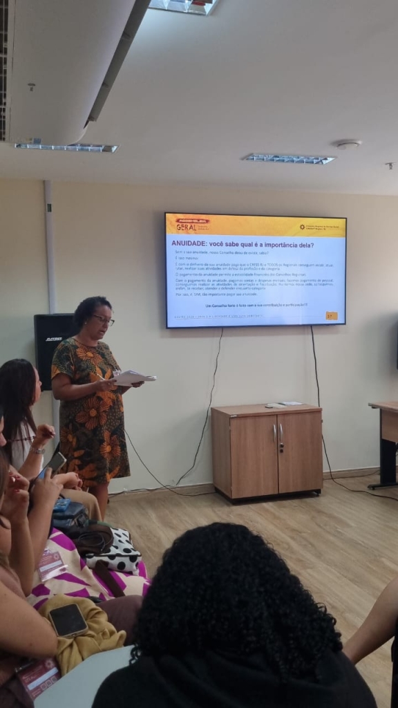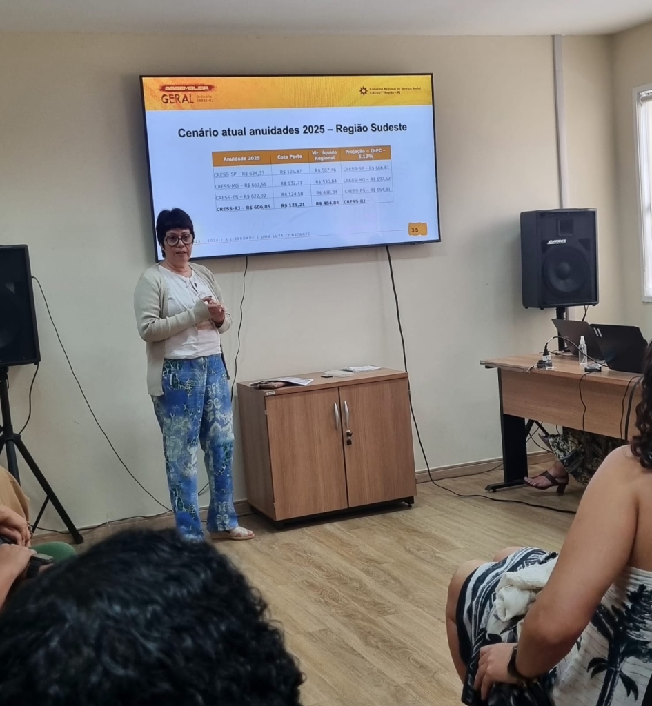 Em seguida Anália falou sobre o 52º Encontro Nacional do Conjunto CFESS/CRESS (realizado em setembro), quando houve a deliberação sobre o reajuste da Anuidade 2026 para pessoa física e para pessoa jurídica. A plenária do Encontro Nacional deliberou sobre o patamar máximo e mínimo para o reajuste da anuidade de pessoa física que podem ser praticados, e lembrou de um ponto importante que as pessoas, em geral, não sabem, mas que é importante ser explicado à categoria, que é a chamada “cota-parte”, que, conforme normativa do CFESS, o valor de 20% de toda anuidade paga ao CRESS-RJ é repassada para o CFESS. Todos os CRESS realizam o repasse da “cota-parte”, com percentuais que variam entre 5% e 20%, conforme o quantitativo de assistentes sociais inscritas. O repasse dos regionais é fundamental para que o Conselho Federal possa exercer suas funções na defesa da profissão.