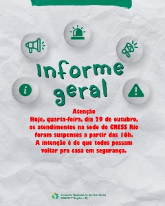 Hoje, quarta-feira, dia 29 de outubro, os atendimentos na sede do CRESS Rio foram suspensos a partir das 16h.
