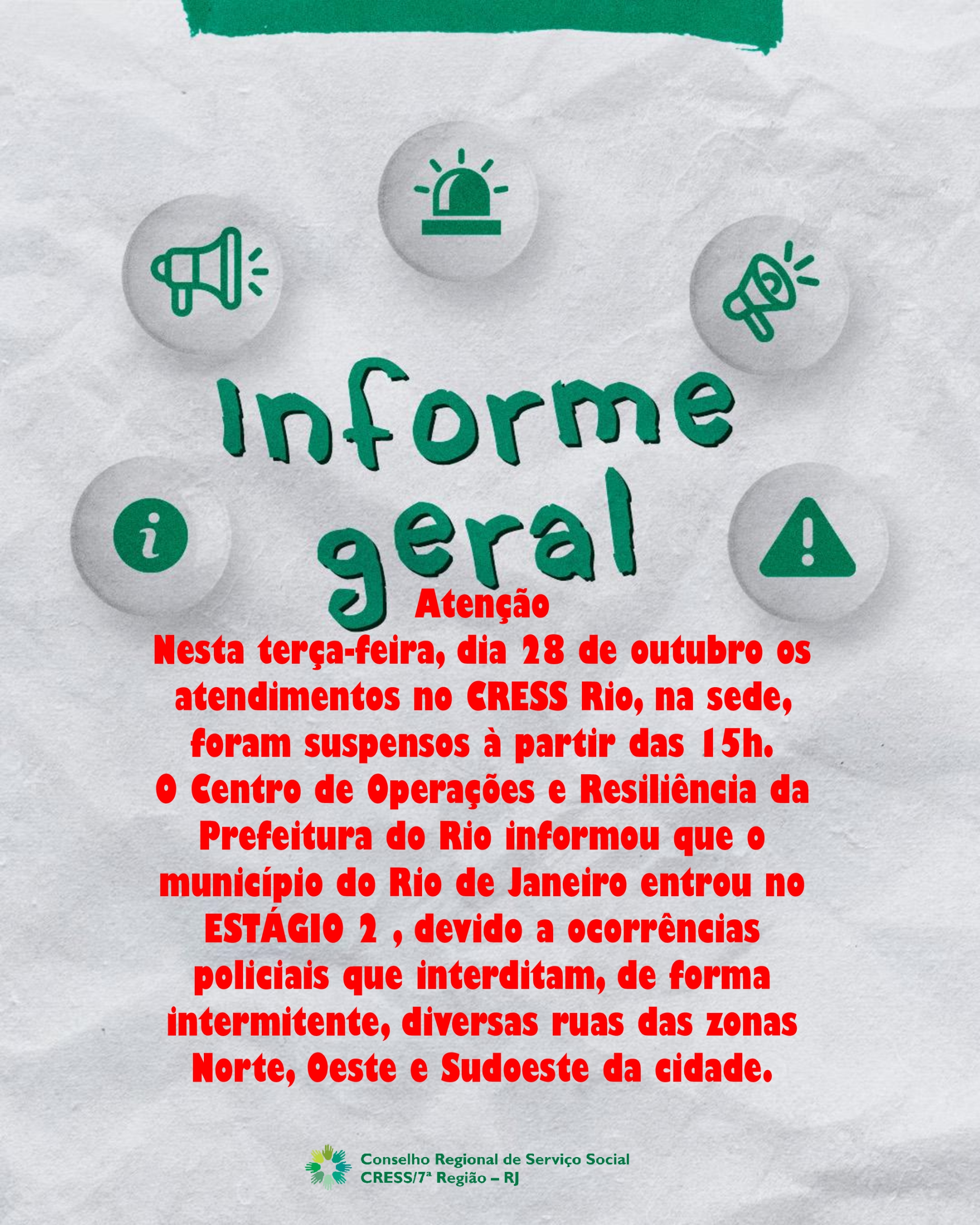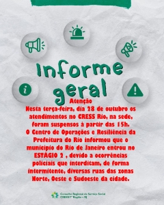 Nesta terça-feira, dia 28 de outubro os atendimentos no CRESS Rio, na sede, foram suspensos à partir das 15h.