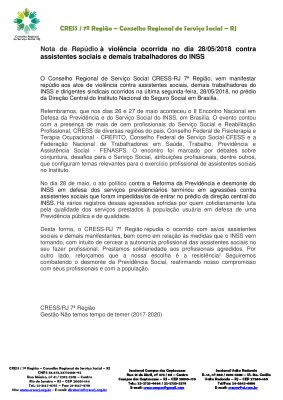 O Conselho Regional de Serviço Social CRESS-RJ 7ª Região, vem manifestar repúdio aos atos de violência contra assistentes sociais, demais trabalhadores do INSS e dirigentes sindicais ocorridos na última segunda-feira, 28/05/2018, no prédio da Direção Central do Instituto Nacional do Seguro Social em Brasília.