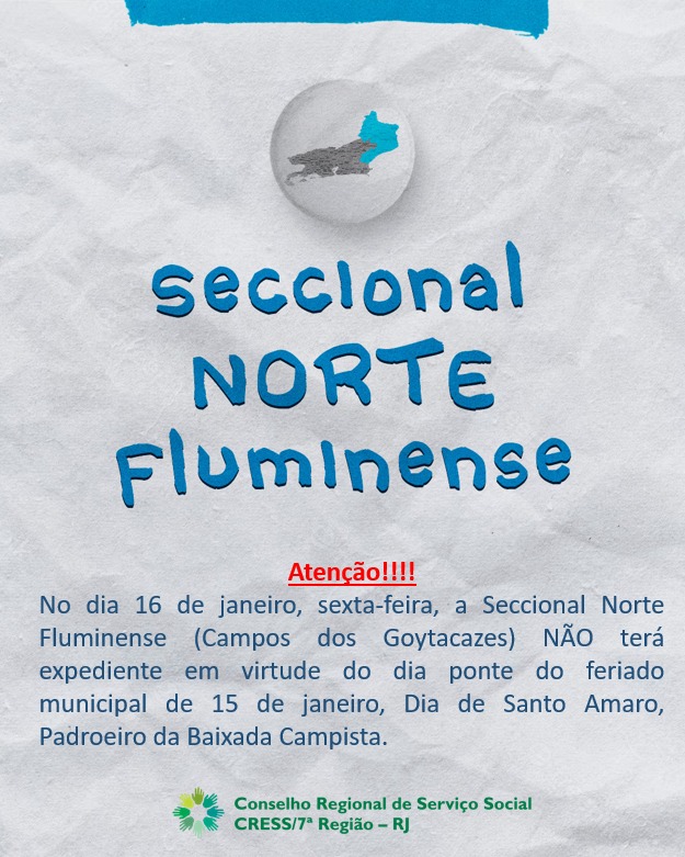 No dia 16 de janeiro, sexta-feira, a Seccional Norte Fluminense (Campos dos Goytacazes) NÃO terá expediente em virtude do dia ponte do feriado municipal de 15 de janeiro, Dia de Santo Amaro, Padroeiro da Baixada Campista.