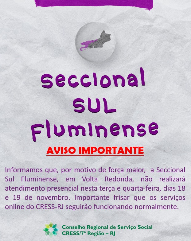 Informamos que, por motivo de força maior, a Seccional Sul Fluminense, em Volta Redonda, não realizará atendimento presencial nesta terça e quarta-feira, dias 18 e 19 de novembro.