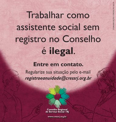 Ver Imagem Maior Trabalhar como assistente social sem registro no Conselho é ilegal melhorweb2018-11-23T12:27:36-02:0023/11/2018 12:27|Categorias: Destaques|Nenhum Comentário Trabalhar como assistente social sem registro no Conselho é ilegal Notícias Relacionadas O CRESS/RJ reafirma o repúdio à ação genocida provocada por agentes de Estado e reforça o compromisso da categoria das assistentes sociais com a defesa intransigente dos direitos humanos! 30/10/2025 12:59 Hoje, quarta-feira, dia 29 de outubro, os atendimentos na sede do CRESS Rio foram suspensos a partir das 16h. 29/10/2025 16:23 Nesta terça-feira, dia 28 de outubro os atendimentos no CRESS Rio, na sede, foram suspensos à partir das 15h. 28/10/2025 15:25 O GT assistentes sociais que atuam nesses espaços, com suas especificidades e desafios. 23/10/2025 16:22 Devido a problemas técnicos, os telefones da sede do CRESS RJ estão inoperantes. 23/10/2025 14:46 “Das ruas para as ruas”: Comissão de Assistência Social do CRESS-RJ realiza roda de conversa com Vânia Rosa, que foi pessoa em situação de rua por 14 anos 22/10/2025 17:31
