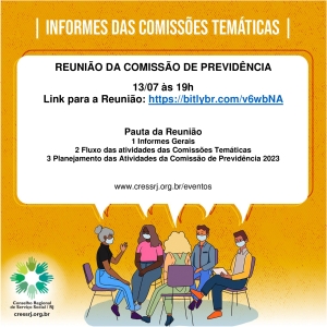 #descriçãodaimagem Card padrão de informe das comissões temáticas traz as informações descritas acima, logo do CRESS e ilustração de pessoas reunidas e uma roda de conversa.