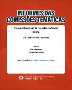 #descricaodaimagem Card padrão da reuniões de Comissões Temáticas do CRESS Rio. No centro um quadro branco com as informações e, no entorno, um fundo vermelho tijolo
