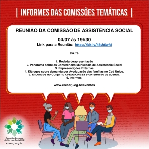 #descriçãodaimagem Card padrão das reuniões de comissões temáticas do CRESS, com pessoas sentadas em cadeiras , todas de máscara, dialogando. Imagem sobre fundo vermelho.
