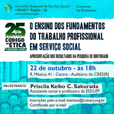 O ensino dos fundamentos do trabalho profissional em Serviço Social – Apresentação dos resultados da pesquisa de doutorado. Palestrante Keiko C. Sakurada, assistente social e professora da ESS/UFF. Dia 22 de outubro, 18h. Local Rua México 41, 12o andar. Inscrições e-mail eventos@cressrj.org.br