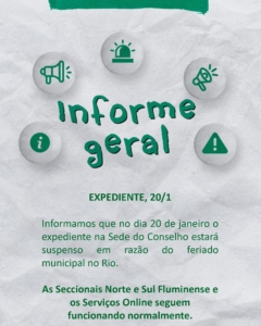 ℹ️ Informamos que no dia 20 de janeiro o expediente na Sede estará suspenso em razão do feriado municipal no Rio.