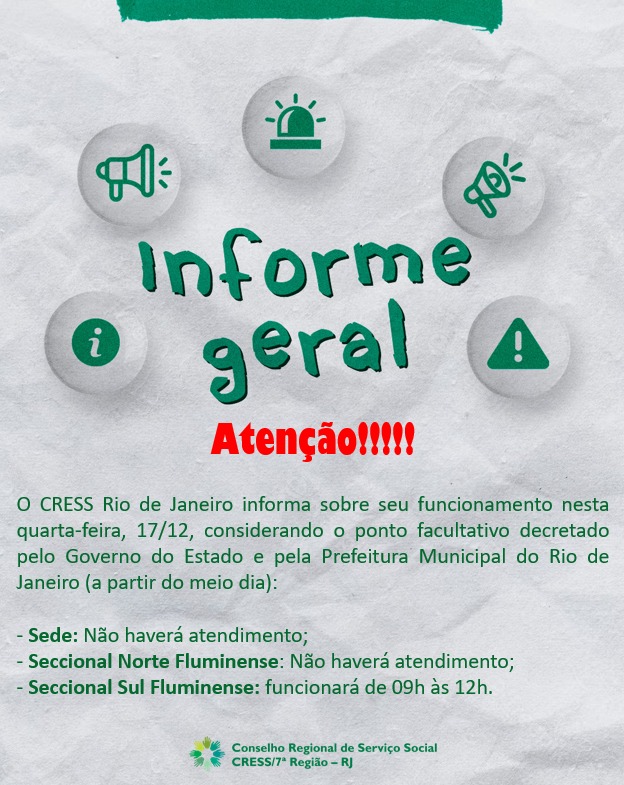 Atenção!!!!! Devido ao ponto facultativo decretado pela Prefeitura do Rio e pelo Governador do Estado para esta quarta-feira, 17 de dezembro, a partir das 12h – em função dos jogos de Flamengo e Vasco, que disputam, respectivamente, as finais da Copa Internacional e Copa do Brasil – o CRESS-RJ informa o horário de funcionamento, neste dia.