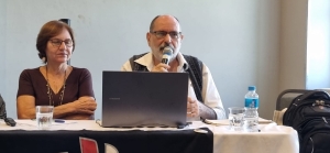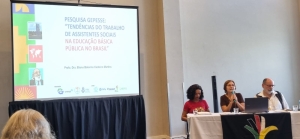 A mesa temática do dia discutiu a  “Política Educacional e Tendências do Trabalho de assistentes sociais na educação básica no Brasil”, que teve como palestrantes convidados Ney Luis Teixeira, professor da FSS/UERJ e líder do GEPESSE, e Eliana Bolorino Canteiro Martins, professora do DSS/UNESP e líder do GEPESSE.