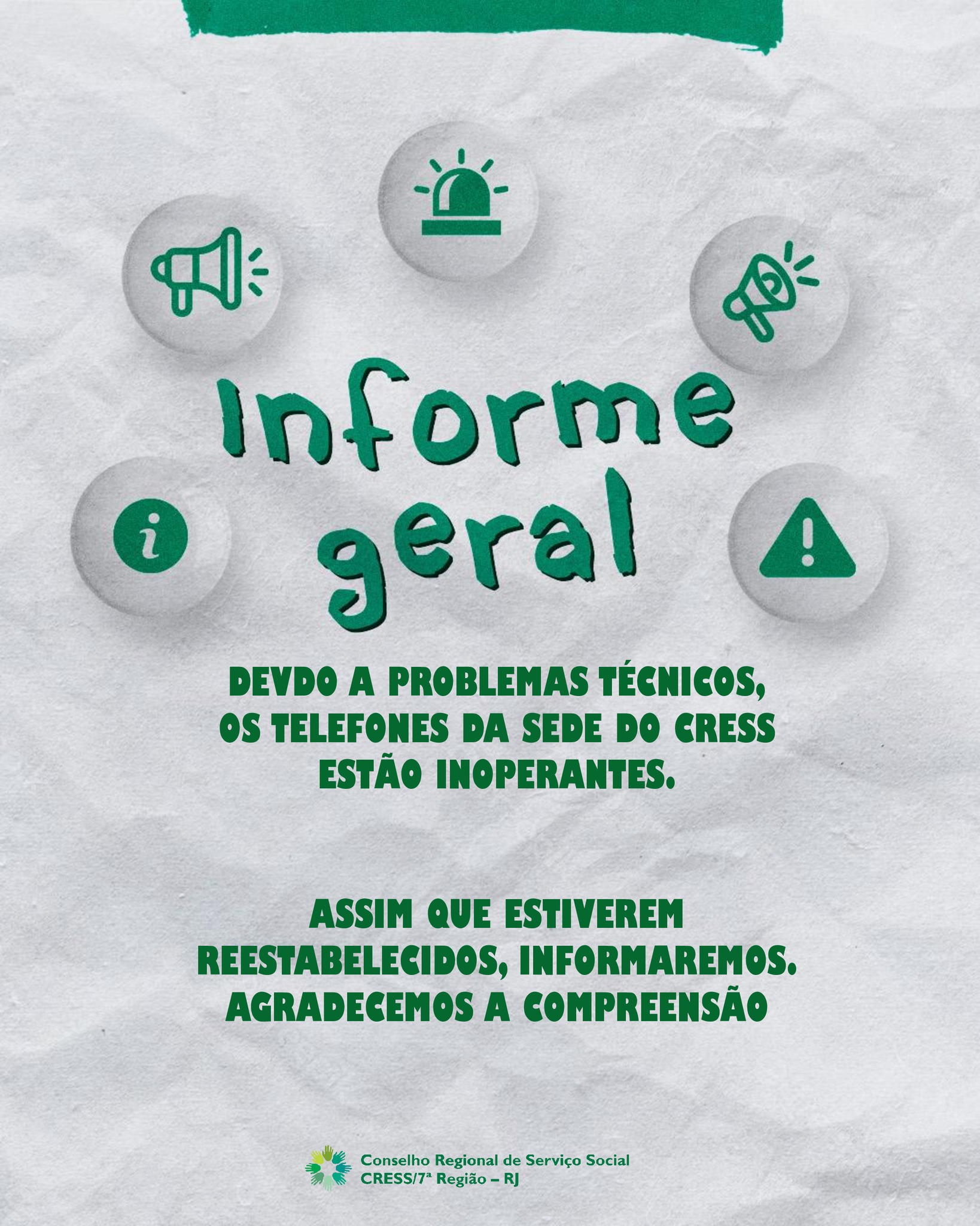 Devido a problemas técnicos, os telefones da sede do CRESS RJ estão inoperantes.