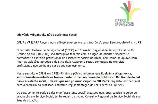Nesse sentido, o CFESS e o CRESS-RS vêm a público informar que Edelvânia Wirganovicz, supostamente envolvida na trágica morte do menino Bernardo Boldrini no Rio Grande do Sul, não é assistente social, uma vez que não possui inscrição ativa no CRESS-RS, requisito indispensável para o exercício da profissão, conforme regulamentação da Lei Federal nº 8662/93.