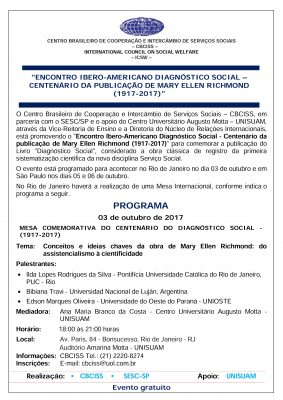 O Centro Brasileiro de Cooperação e Intercâmbio de Serviços Sociais – CBCISS, em parceria com o SESC/SP e o apoio do Centro Universitário Augusto Motta – UNISUAM, através da Vice-Reitoria de Ensino e a Diretoria do Núcleo de Relações Internacionais, está promovendo o “Encontro Ibero-Americano Diagnóstico Social – Centenário da publicação de Mary Ellen Richmond (1917-2017)” para comemorar a publicação do Livro “Diagnóstico Social”, considerado a obra clássica de registro da primeira sistematização cientifica da nova disciplina Serviço Social. O evento está programado para acontecer no Rio de Janeiro no dia 03 de outubro e em São Paulo nos dias 05 e 06 de outubro. No Rio de Janeiro haverá a realização de uma Mesa Internacional, conforme indica o programa a seguir.