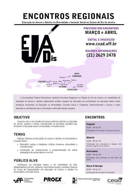A Universidade Federal Fluminense, por meio do Núcleo de Educação e Cidadania faz saber queestão abertas as inscrições para a participação de professores nos Encontros Regionais da formação continuada dos profissionais da educação na modalidade de Educação de Jovens e Adultos, visando à discussão da relação entre Educação na Diversidade, Inclusão Social e Cidadania, democratizando o acesso a estes assuntos e contribuindo para a formação de sujeitos críticos e atuantes.