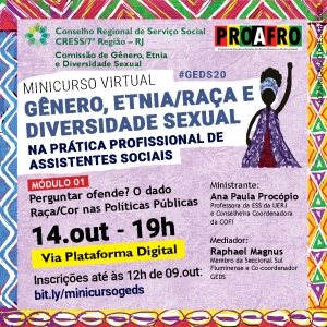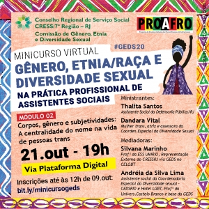 A atividade compõe a programação alusiva aos 20 anos da Comissão de Gênero, Etnia e Diversidade Sexual (GEDS) do CRESS RJ e tem o objetivo de oferecer à categoria a oportunidade de refletir sobre a prática profissional tendo em vista a importância da articulação das categorias de gênero, raça/etnia e diversidade sexual na qualificação do exercício profissional.