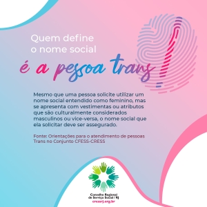 Entendendo que a luta contra a transfobia (que é a violência contra travestis, transexuais e transgêneros) deve ser travada todos os dias nas mais diversas esferas, o Conselho Regional de Serviço Social 7ª Região (CRESSRJ) divulgou uma série de cards com informações sobre a utilização do nome social no âmbito do Conjunto CFESS-CRESS.