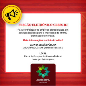 #Descricaodaimagem Texto em borda em tons vermelhos com megafone destacado em círculo branco. Na parte inferior central, a logo do CRESS-RJ. Texto: PREGÃO ELETRÔNICO CRESS-RJ. Para contratação de empresa especializada em serviços gráficos para a impressão de 19.000 planejadores mensais. Mais informações no link do edital! DATA DA SESSÃO PÚBLICA Dia 29/11/2024, às 09h (horário de Brasília). LOCAL Portal de Compras do Governo Federal www.gov.br/compras