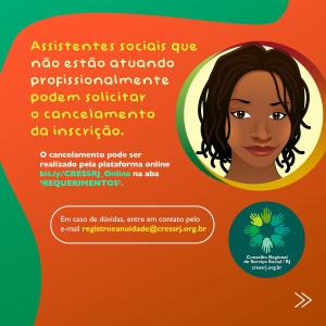 O cancelamento pode ser realizado pela plataforma online bit.ly/CRESSRJ_Online na aba ‘REQUERIMENTOS’