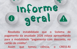 Atenção!!! Identificamos instabilidades no sistema de pagamento da anuidade 2026 com desconto no cartão de crédito. O CRESS-RJ já solicitou à empresa o ajuste necessário. Neste momento, sugerimos efetuar o pagamento por boleto bancário.