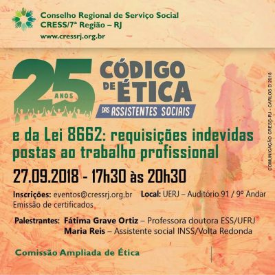 – Organizado peal Comissão ampliada de Ética, o evento acontecerá dia 27/09, 17h30, no auditório 92 da UERJ. Inscrições