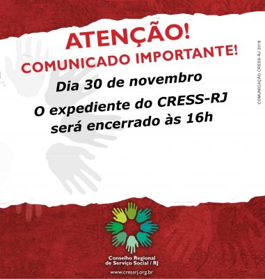 Ver Imagem Maior Aviso Importante melhorweb2018-12-03T15:25:16-02:0029/11/2018 14:34|Categorias: Seccional Sul Fluminense|Nenhum Comentário Dia 30 de novembro (sexta-feira) O expediente do CRESS-RJ será encerrado às 16h Notícias Relacionadas 52º Encontro Descentralizado da Região Sudeste: a força do coletivo e a defesa da democracia marcaram os três dias de evento 04/08/2025 13:41 Seccional Sul Fluminense – 13 junho não haverá expediente 11/06/2025 15:28 Agenda 2025 Assistente Social esgotada na Sede! 22/11/2024 14:04 Atendimento na sede do CRESS-RJ entre os dias 15 e 20 de novembro será suspenso 06/11/2024 15:08 A Agenda 2025 Assistente Social já chegou em nosso regional. Valor : R$ 9. As vendas acontecem apenas em espécie e através de PIX, apenas presencialmente. Limitado em 10 unidades por pessoa. 31/10/2024 11:58 16/08 – Assembleia Geral Ordinária para composição da diretoria provisória da Seccional Sul Fluminense 12/08/2024 15:39
