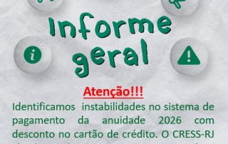 Atenção!!! Identificamos instabilidades no sistema de pagamento da anuidade 2026 com desconto no cartão de crédito. O CRESS-RJ já solicitou à empresa o ajuste necessário. Neste momento, sugerimos efetuar o pagamento por boleto bancário.