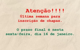 Atenção!!!! Essa é a última semana para inscrição de chapas; prazo final é nesta sexta-feira, dia 16 de janeiro
