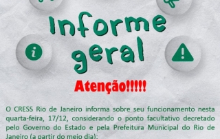 Atenção: ponto facultativo decretado para esta quarta-feira, 17 de dezembro, a partir das 12h, impacta o funcionamento do CRESS-RJ, leia aqui: