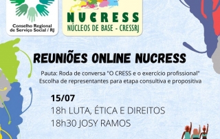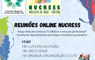 Assistente social, As reuniões online junto aos 13 NUCRESS vinculados ao CRESS-RJ (Sede e Seccionais) acontecem entre os dias 08 e 20 de julho de 2020. Pauta: 1- Roda de Conversa com a Temática "O [...]
