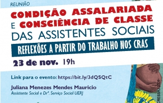 Reunião online ‘Condição assalariada e consciência de classe das assistentes sociais: reflexões a partir do trabalho nos CRAS’ 23/11 às 19h na Plataforma Microsoft Teams. Link: https://bit.ly/3dQSQtC Convidada: Juliana Menezes Mendes Mauricio - Assistente Social [...]